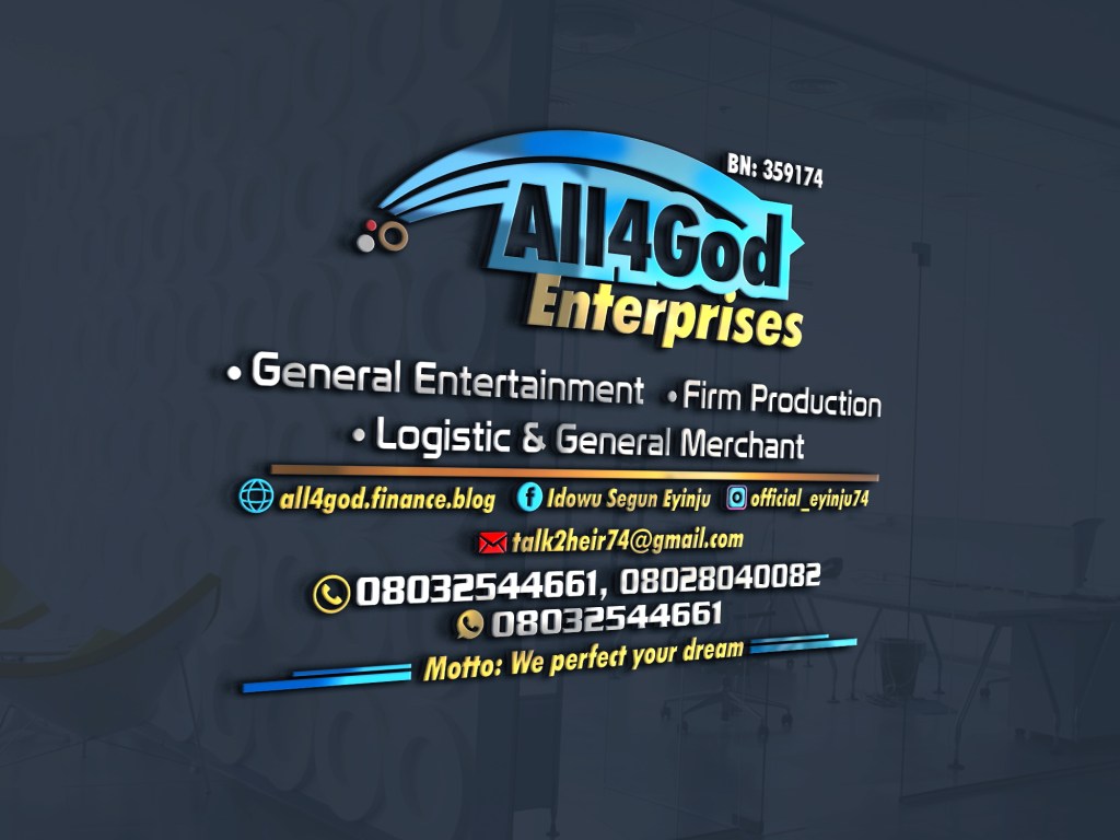 At all4god concepts, we deal with graphics design, web hosting, Point of sales (installation), Group registration and General logistics.